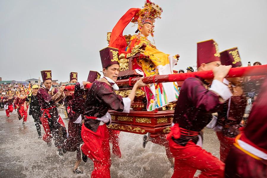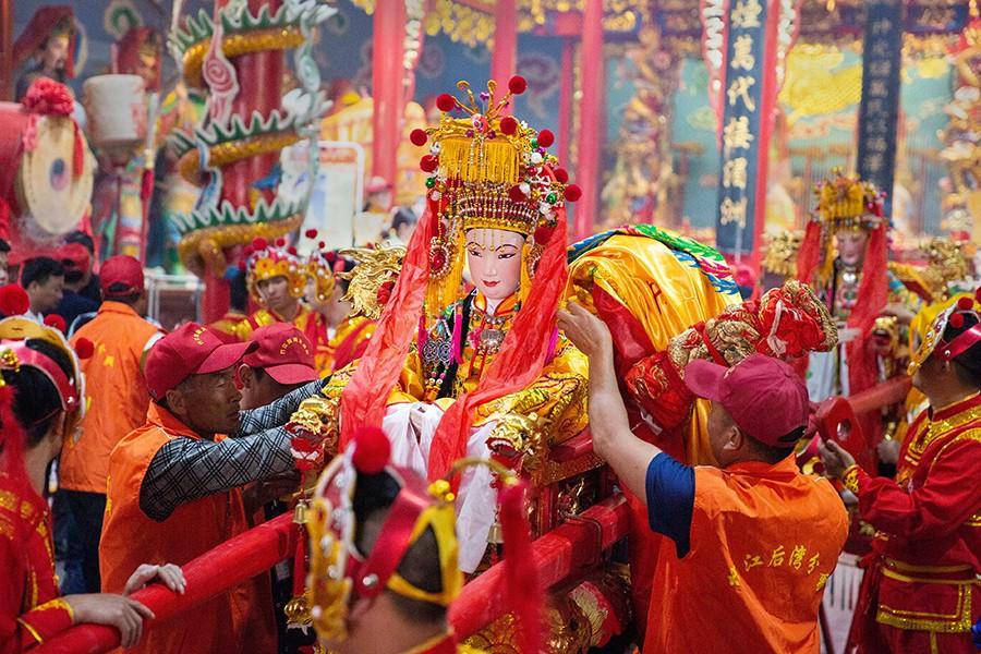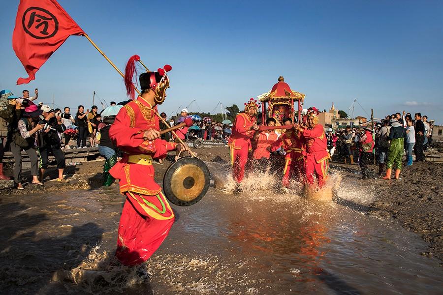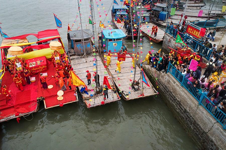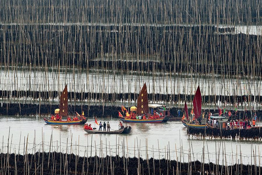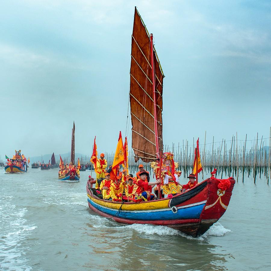 每年霞浦都会在海上举行“妈祖走水”民俗活动,扶妈祖神像正襟危坐轿上,选精壮数十人抬到海滨,一边吆喝一边迅跑,以此祈求平安与丰收。