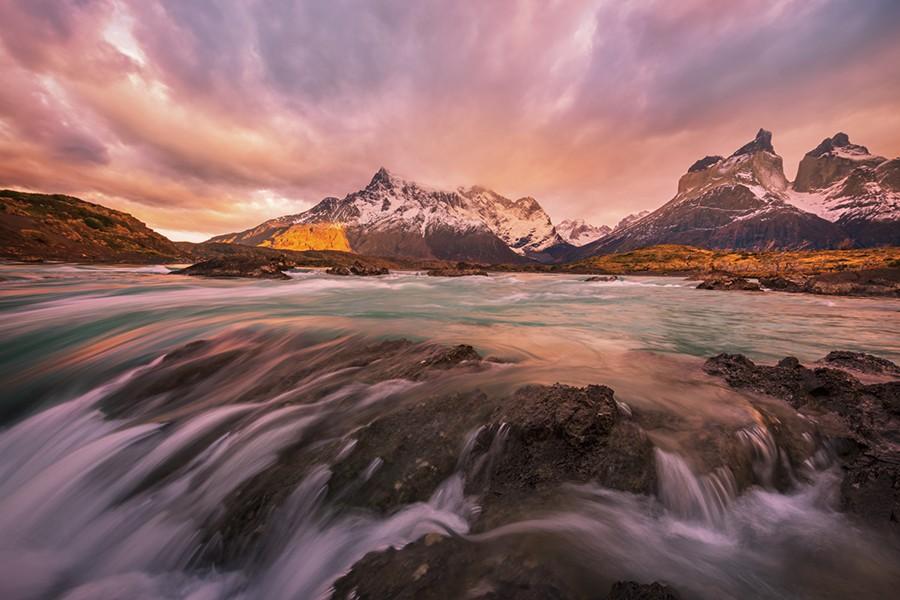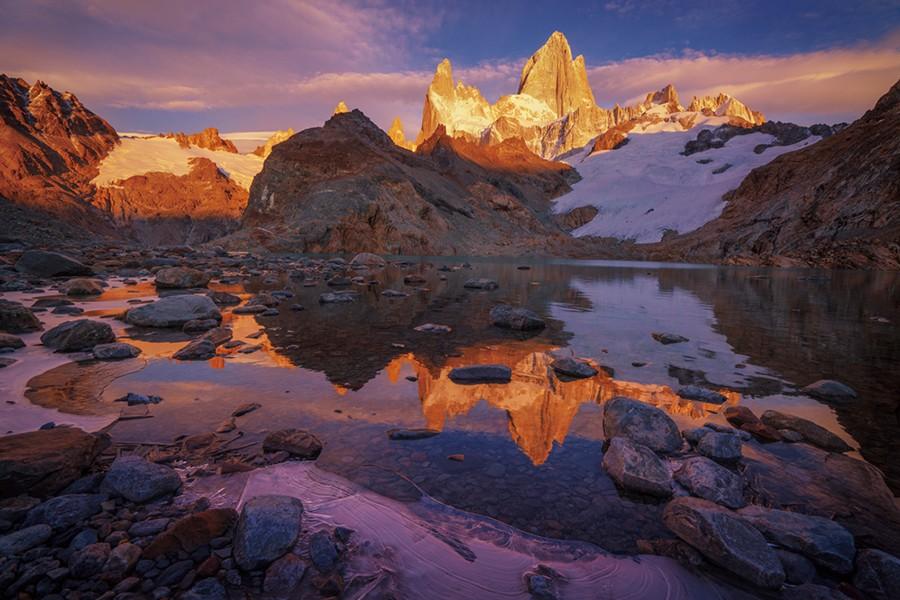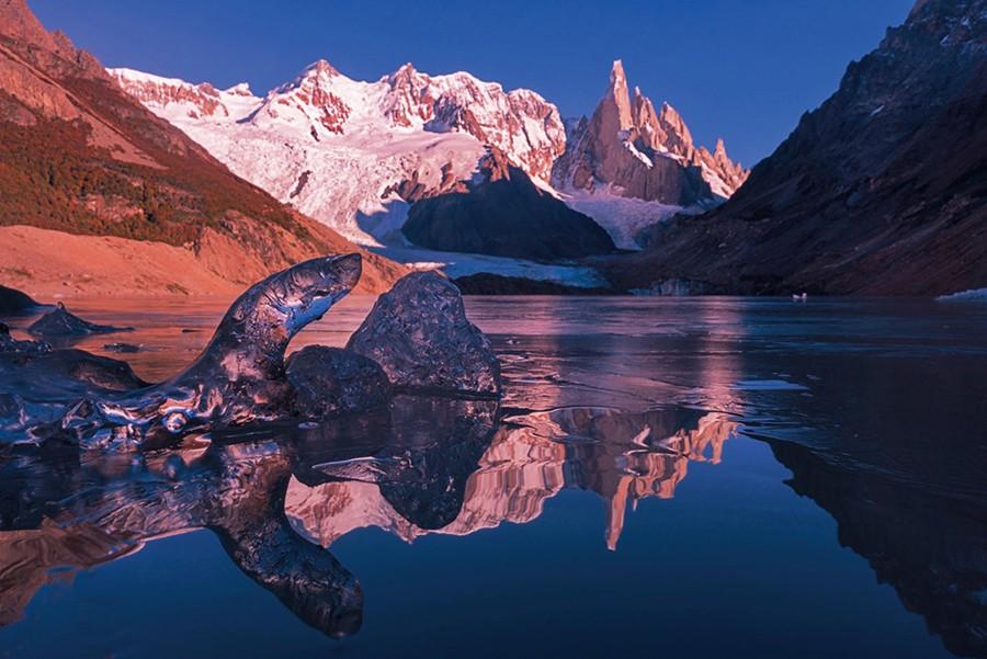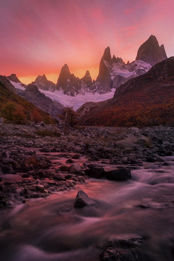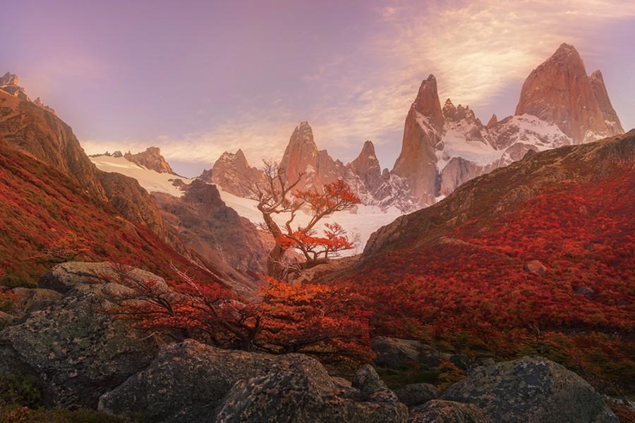 传奇的菲茨罗伊峰(Fitz Roy), 托雷峰(Cerro Torre), 百内三塔(Torres del Paine)被誉为全世界最美的⼭峰之⼀。 巴塔哥尼亚的秋天也被誉为世界最美秋⾊。