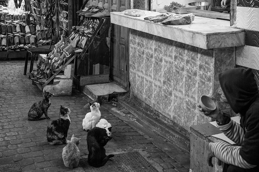 商铺外的人、猫与肉,菲斯古城,2018年6月20日  陈正军