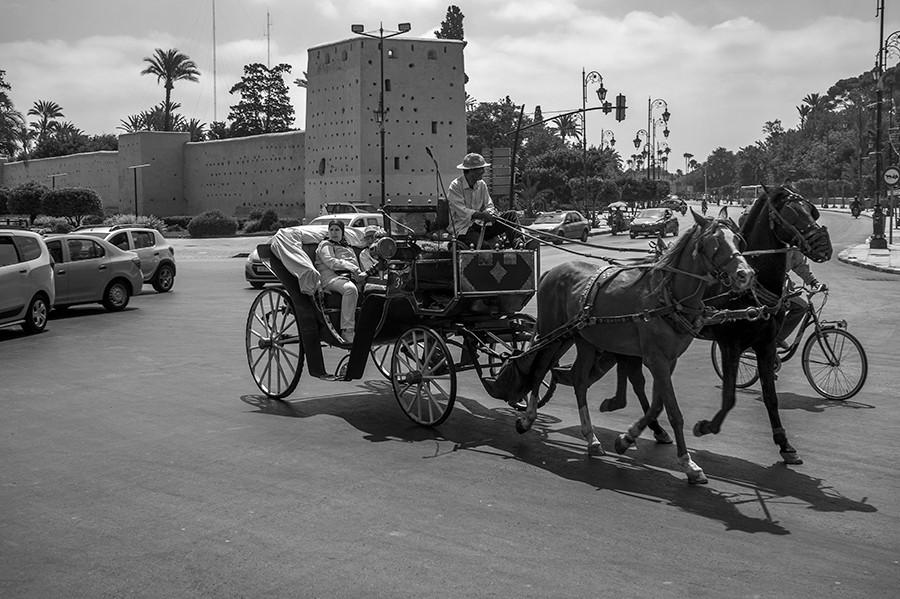 古城里的马车、汽车和自行车,马拉喀什,2018年6月24日  陈正军