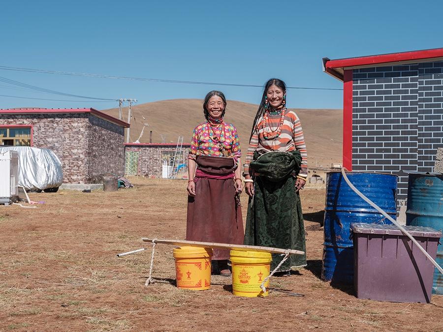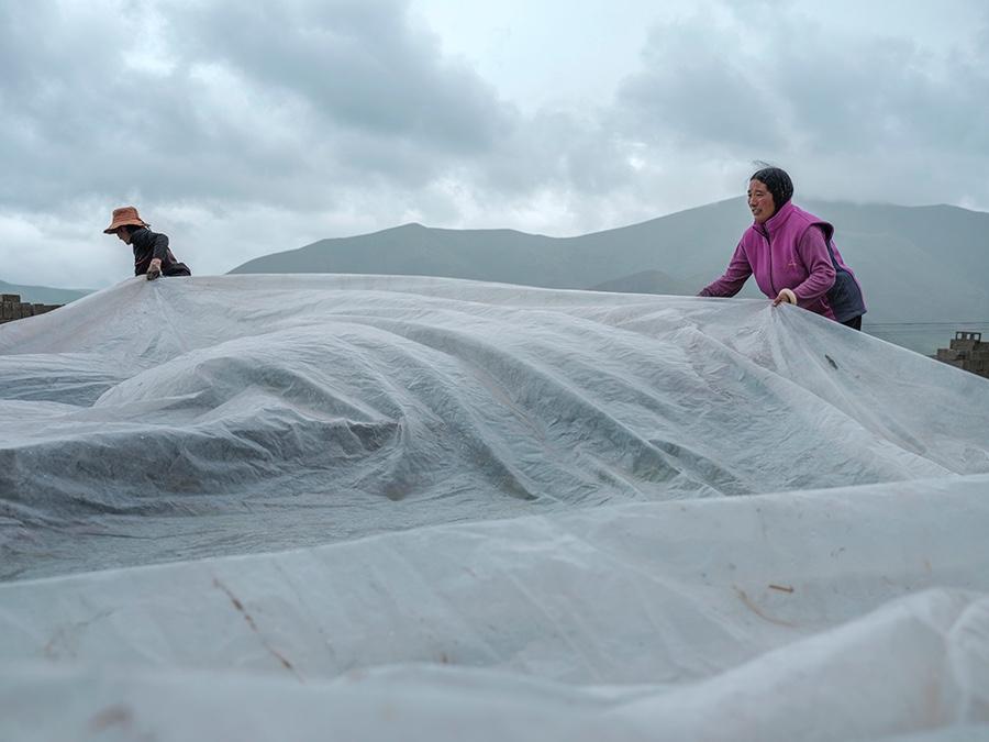 大雨来临,几个藏族妇女抢盖预制砖。2019年8月4日,石渠