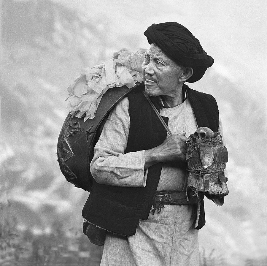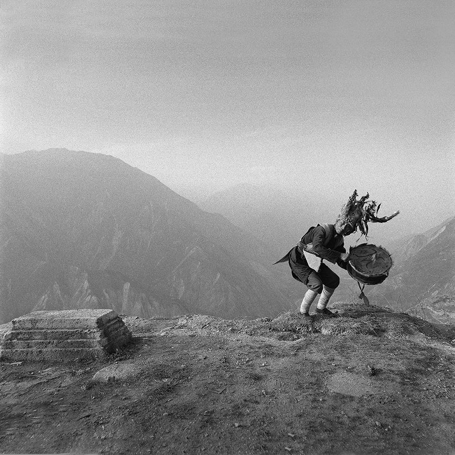 在我走上羌山,按动快门之前,我就反复地思考着,我应以怎样的 视角去看待大地震之后的中国羌人?几千年历史时空中生生不息的“羌”?1950年代被识别为中国55个少数民族之一的“羌”?大地震前后常出现在旅游表演场所和媒体镜头前的“羌”?深谷高山之间耕种劳作的“羌”?哪一个才是我理想中的真实影像?现 在,萝卜寨释比王明杰往我面前一站,他头戴金丝猴皮帽,手持羊皮鼓,脚踩禹步,身后是苍茫深远的岷江大谷……我感到,这就是我心中的“羌”,是现实与理想,在我心中叠化而成的影像。