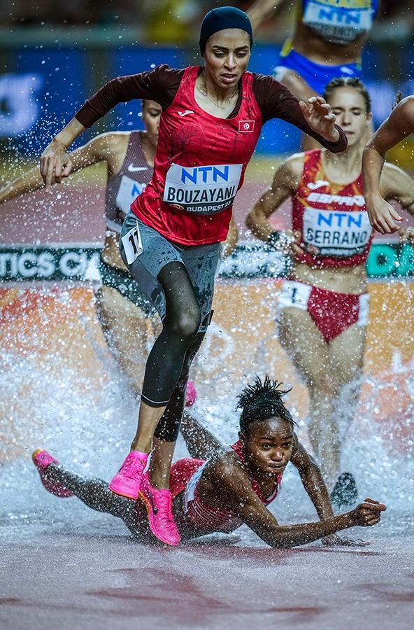 2023年8月23日 ,布达佩斯田径世锦 赛在匈牙利国家田径中心进行第五天的赛事。图为女子3000米障碍预赛中,一 名选手不慎跌倒。 魏征