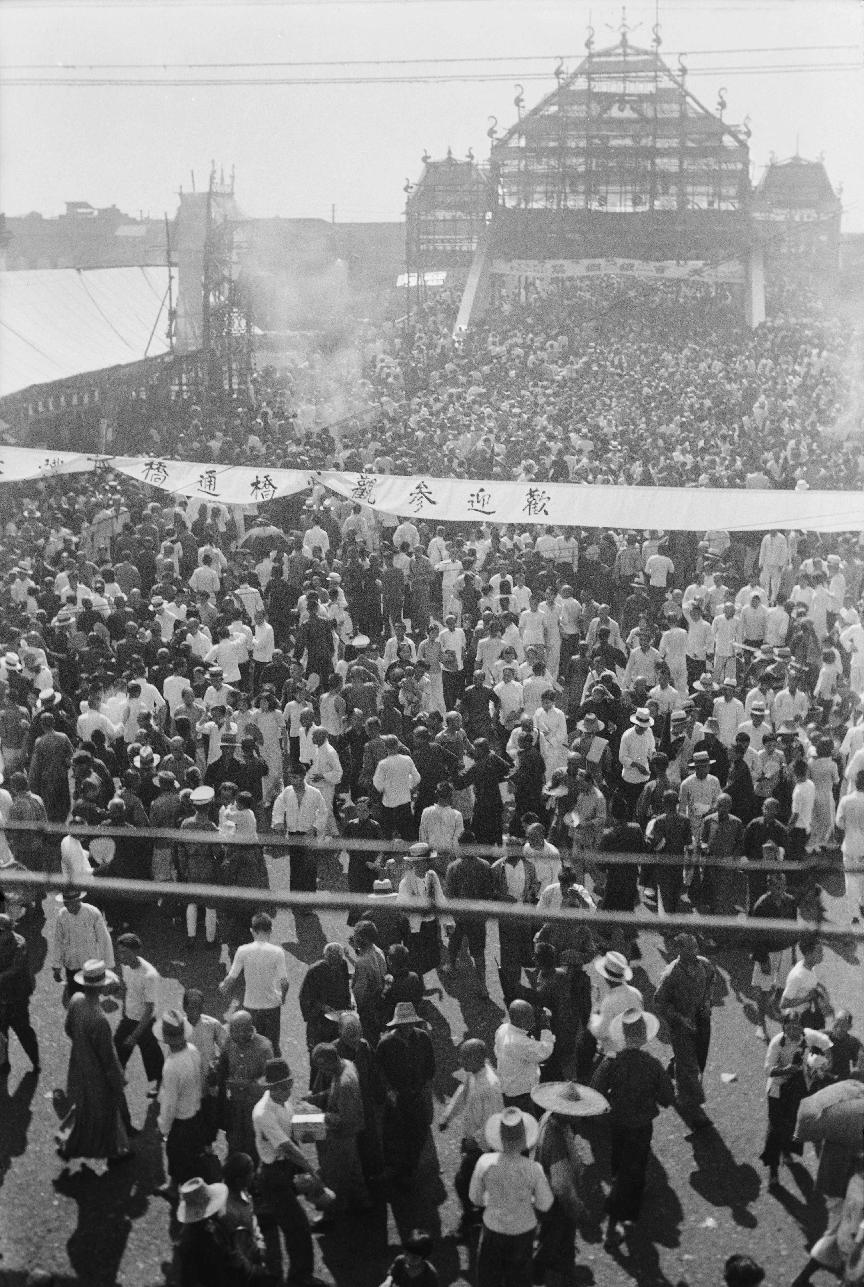 大灾后,1931年,宁波旅沪同乡会牵头集资,计划在老江桥原址兴建钢架结构灵桥,预算工程费约为50万银圆。1934年5月1日,灵桥改建工程正式动工。改建后的灵桥全长97.6米,桥面宽近20米,设计承载能力为20吨,全部吃力在两端的马蹄式桥脚上。工程中的质量要求近乎苛刻,如拌水泥、浇桥面用的砂石,全都用筛子仔细筛过。1936年5月灵桥竣工,同年6月27日举行通桥典礼。照片记录了通桥典礼时万民纷至沓来的热闹场面。
