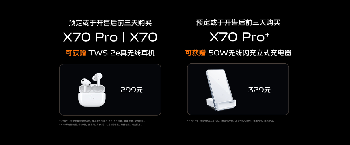 vivo X70系列已在vivo官网、vivo京东自营官方旗舰店、京东vivo官方旗舰店、天猫vivo官方旗舰店、vivo手机苏宁自营旗舰店、天猫苏宁易购官方旗舰店、拼多多、分期乐、唯品会、招商银行掌上生活、平安银行口袋商城、交通银行买单吧、vivo体验店专卖店、vivo终端各大门店等线上线下渠道开启预售。X70系列预售至高享24期分期免息和24个月质保,购X70 Pro+新机还有机会获得329元50W无线闪充立式充电器。vivo X70 Pro及vivo X70 Pro+于9月17日正式开售,X70于9月30日正式开售,敬请关注。