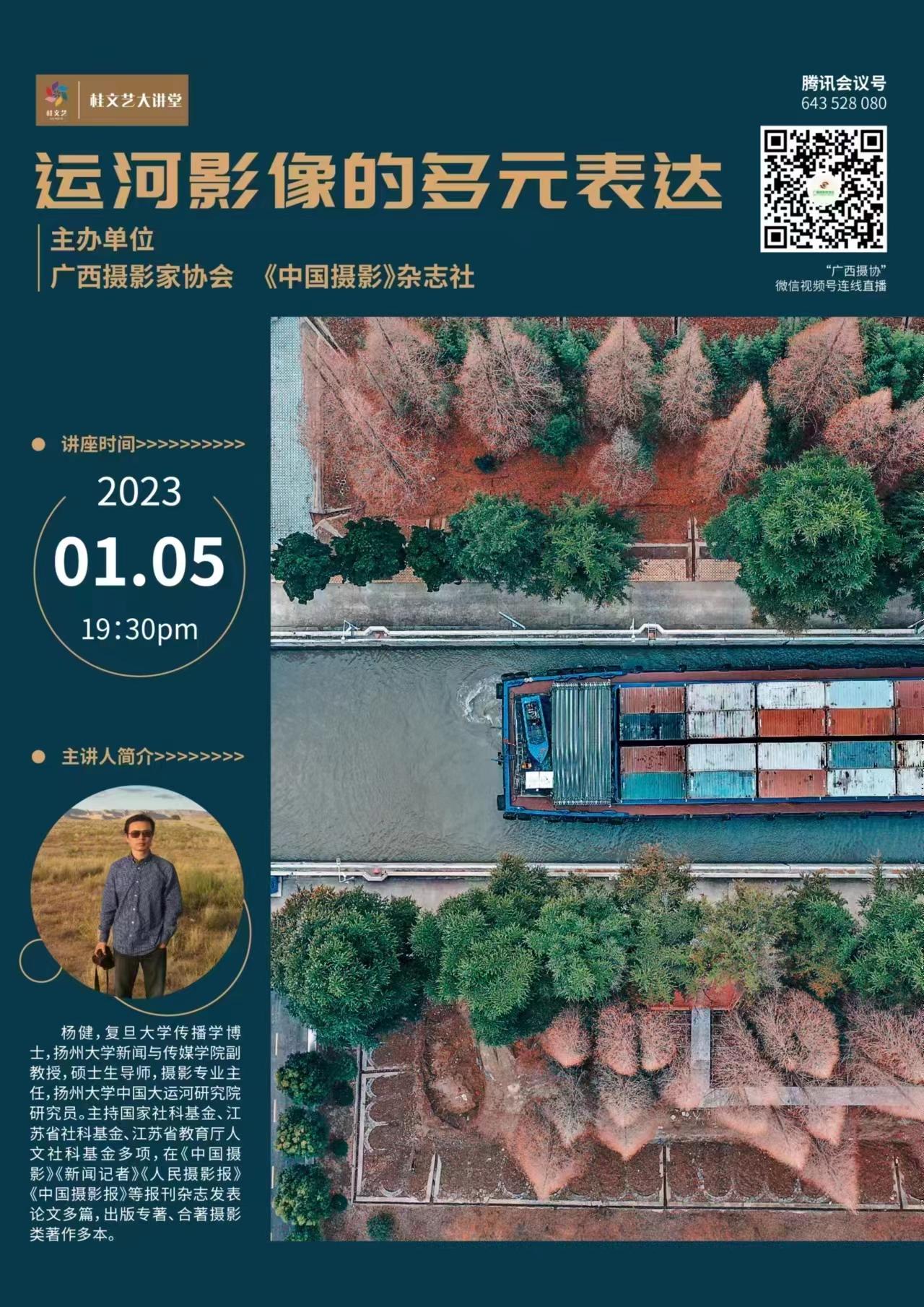 为做好平陆运河建设全景纪实摄影创作,帮助广大摄影师理清创作思路,提高运河主题影像创作能力,广西摄影家协会联合《视觉摄影》杂志社近期邀请扬州大学新闻与传媒学院摄影专业主任、扬州大学中国大运河研究院研究员杨健博士做题为《运河影像的多元表达》的线上讲座,欢迎听讲。