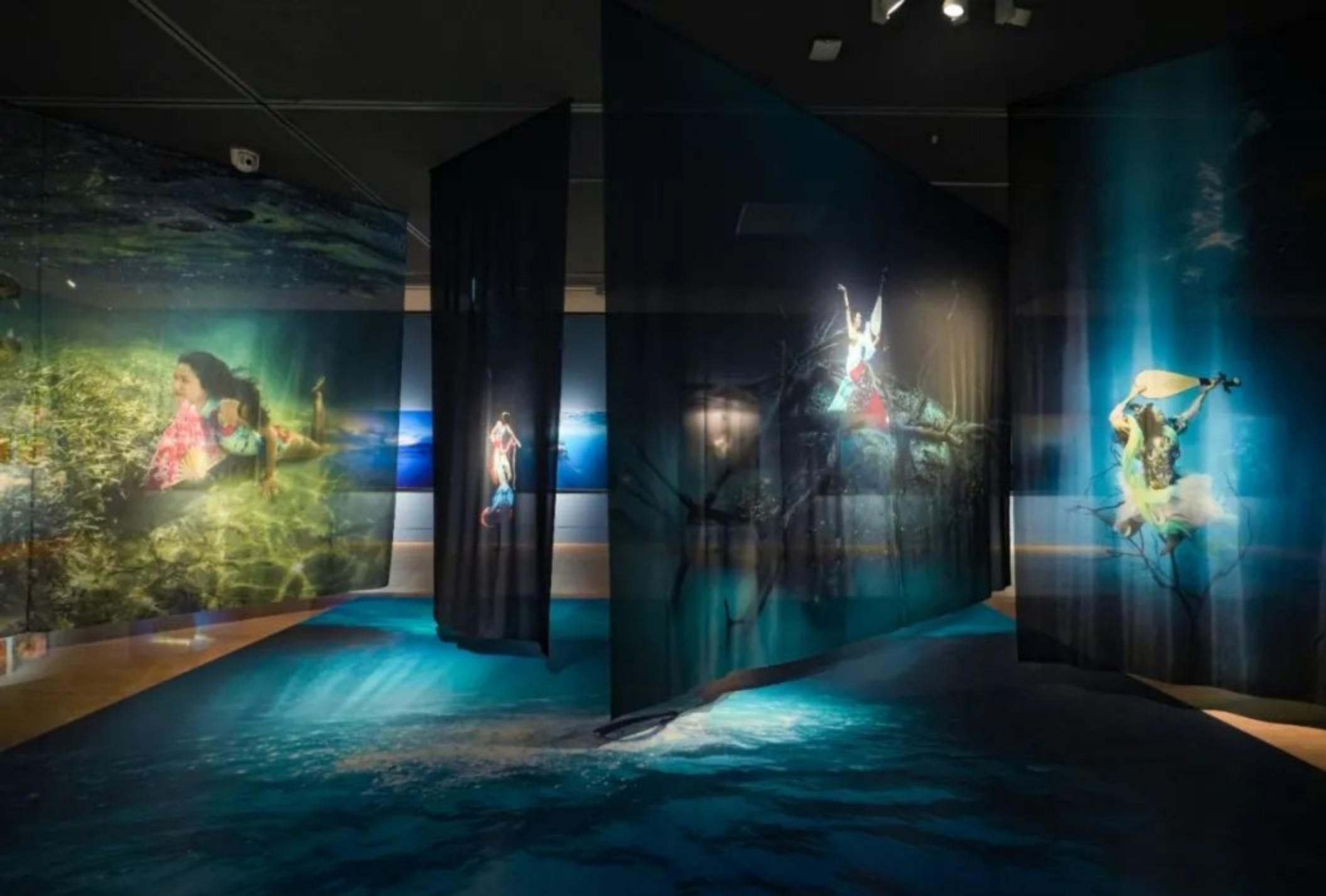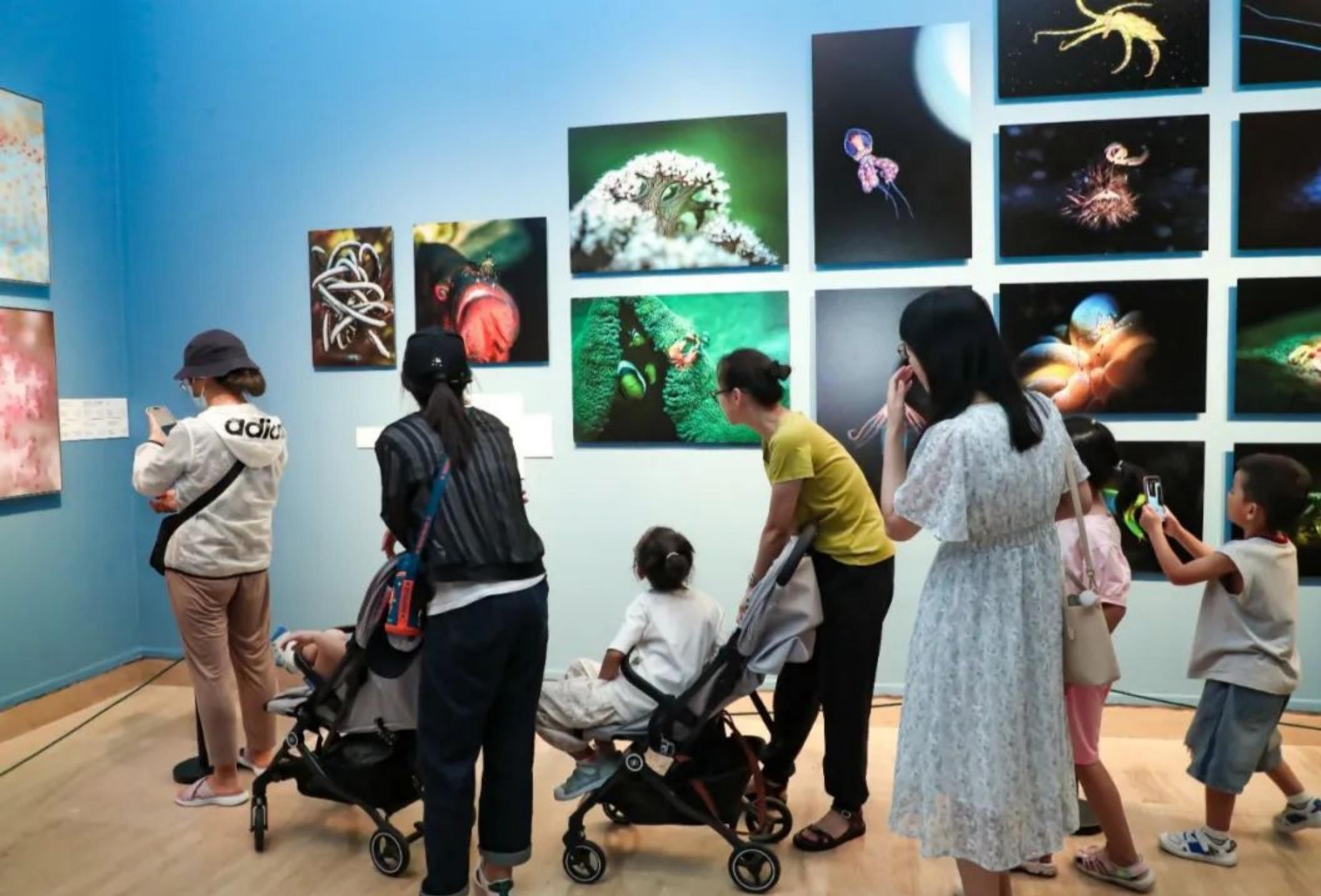 展览现场,独特的展览形式吸引了观众纷纷打卡留影。本次展览策展人之一鲍琪介绍,现场设置沉浸式视频展示区,让观众一进展厅,便有一种被海洋所包裹,身临其境的感受。展览的呈现一方面突出海洋生物的多样性,另一方面也体现展览的艺术性、国际性、保育性。大幅悬垂的纱幔展示的与大翅鲸和谐互动的古典飞天“美人鱼”等作品,营造出海洋的氛围感,让观众可以在观看作品的同时更好地融入展览。